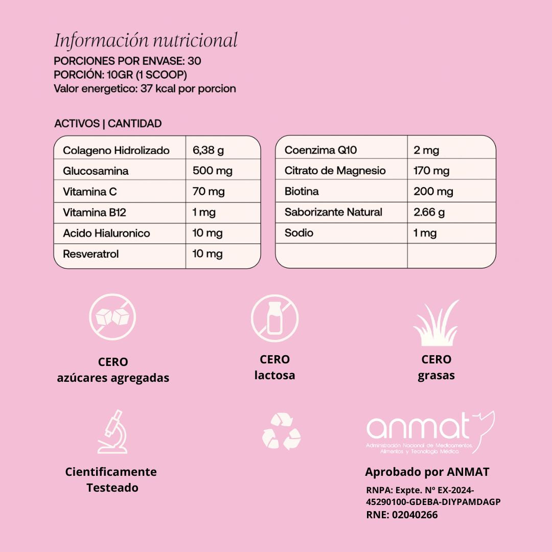 Nuestra fórmula contiene colágeno de alta absorción, magnesio, biotina, vitamina C, coenzima Q10, resveratrol y ácido hialurónico.