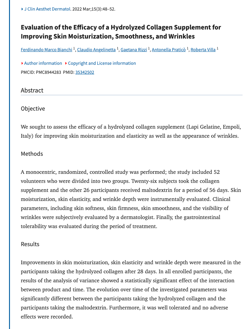 Evidencia: Un ensayo clínico en el Journal of Clinical and Aesthetic Dermatology (Bianchi et al., 2022) demostró mejoras significativas en la piel —hidratación, elasticidad y arrugas— en 28 días. Un metaanálisis de 23 estudios (de Miranda et al., 2021) confirmó que los suplementos de colágeno hidrolizado funcionan. Es un producto seguro, clasificado como sustancia segura por la FDA.