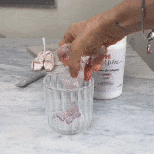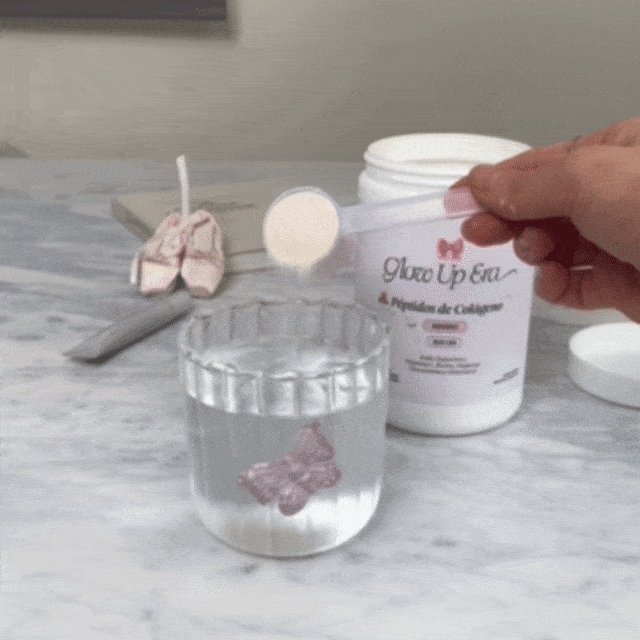 Agarrá un scoop de 10 gramos de colágeno Glow Up Era con la cuchara que viene en el pote, tiralo en un vaso con agua (podés ponerle hielo si querés) y mezclalo bien para preparar tu Beauty Water.